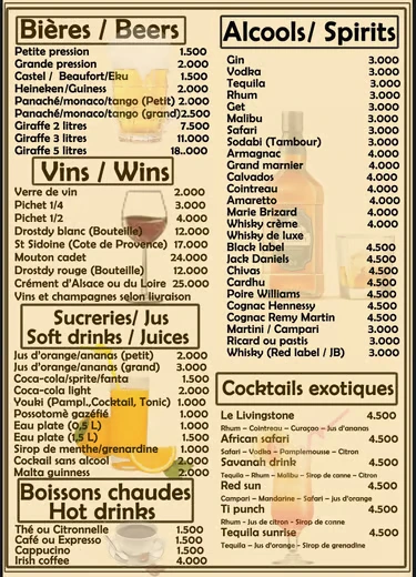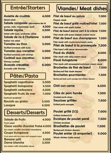 Bienvenue au restaurant Le Livingstone, où nous vous invitons à découvrir notre menu diversifié. Savourez nos délicieuses pizzas, préparées avec des ingrédients frais et de qualité. Explorez notre cuisine française authentique, qui ravira vos papilles avec des plats traditionnels et raffinés. Accompagnez votre repas d'une sélection de boissons soigneusement choisies pour compléter votre expérience culinaire. Tout cela dans une ambiance bon enfant, propice à la détente et au partage.